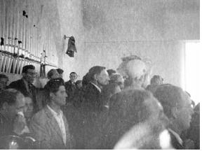Varhany po zásahu 1945 (vpravo za hlavami zazděný průstřel jižní stěny kostela)