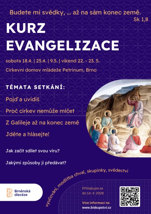 Kurz evangelizace: nabídka pro všechny, kdo se chtějí věnovat evangelizace, ale nemají odvahu nebo neví, jak na to. Během kurzu (probíhá v Brně) vás čekají přednášky, diskuzní skupinky, modlitba chval a svědectví. Přihlásit se je možné do 14. dubna, kurz začíná 18. dubna.