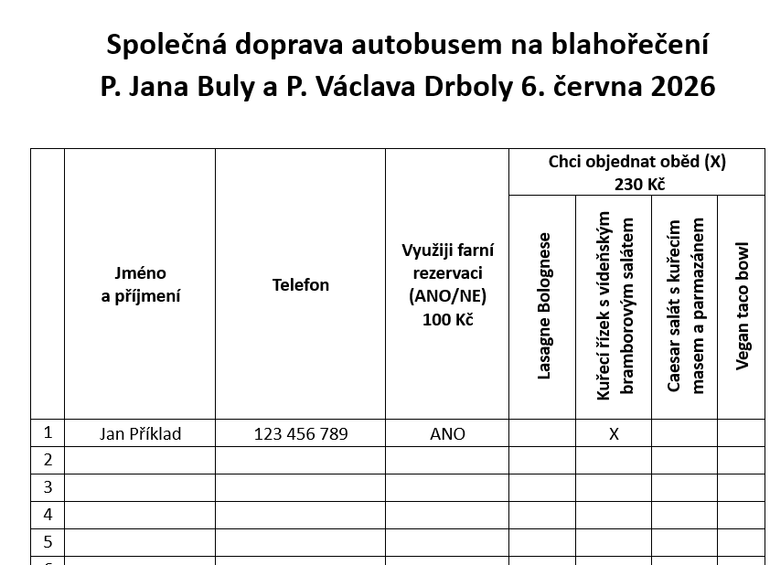 Na slavnost plánujeme vypravit společný autobus. Prosíme všechny zájemce o společnou dopravu, aby se zapsali v kostele vzadu na stolečku na připravený papír.